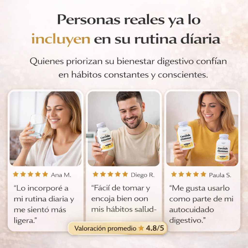 Es un suplemento alimenticio diseñado para apoyar el bienestar digestivo y la función intestinal como parte de una rutina diaria saludable.