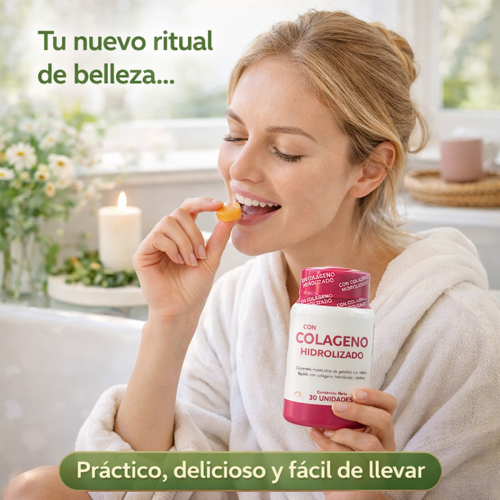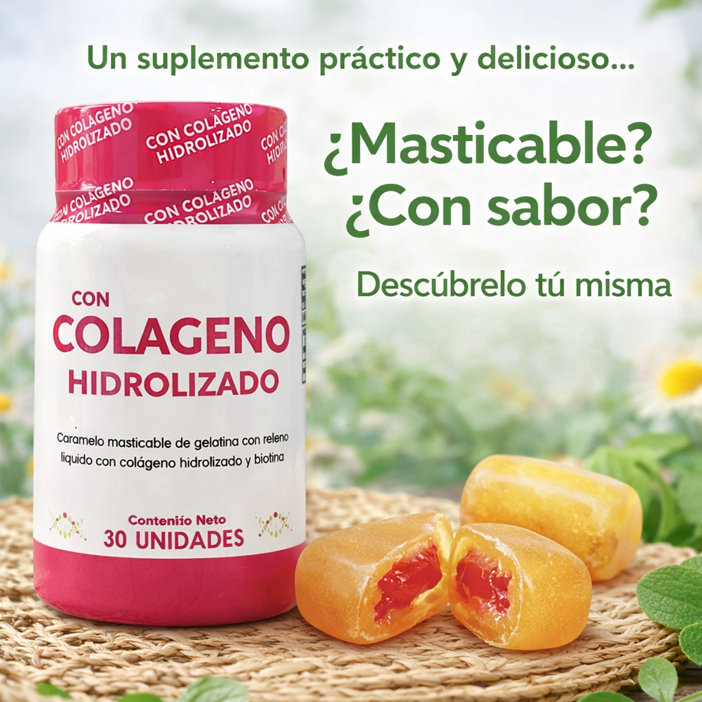 Es un caramelo masticable de gelatina con relleno líquido, elaborado con colágeno hidrolizado y biotina, pensado como un complemento alimenticio de consumo diario.