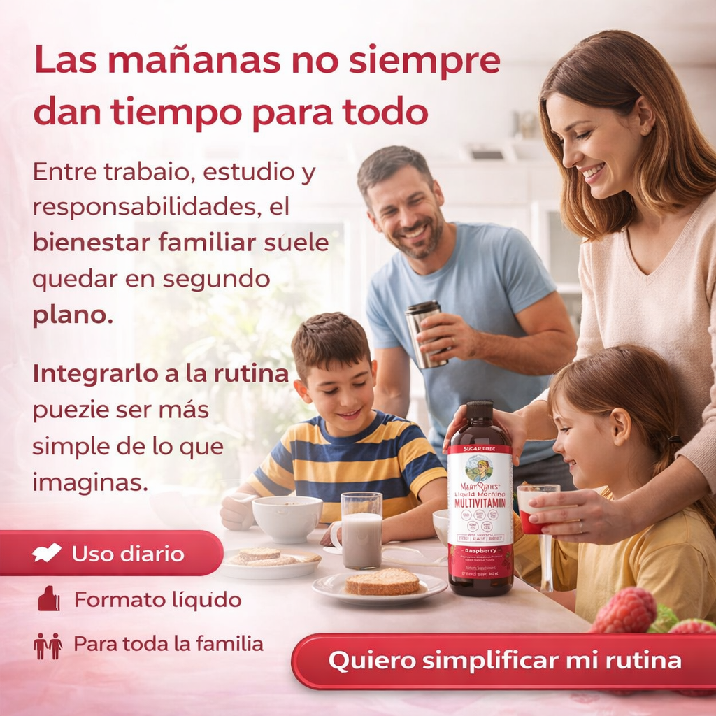 MaryRuth’s Liquid Morning Multivitamin es una fórmula líquida, sin azúcar, con vitaminas esenciales como Vitamina C y D3, pensada para acompañar el bienestar diario de toda la familia.